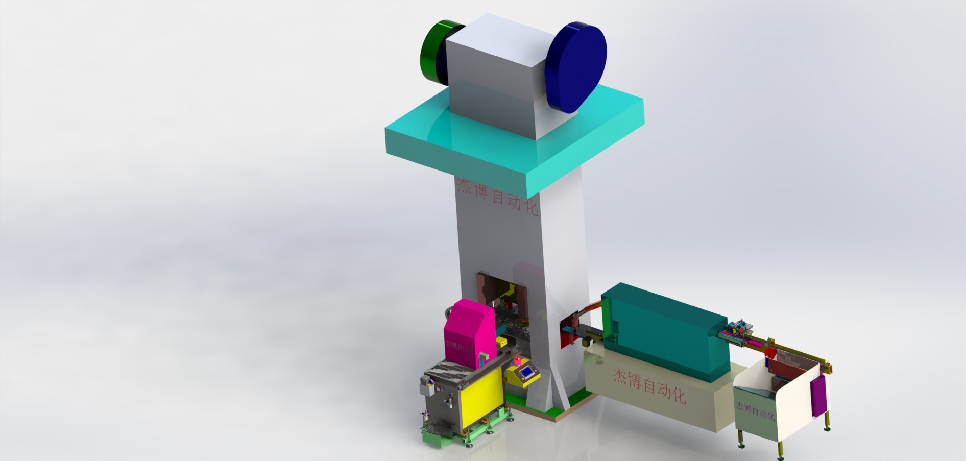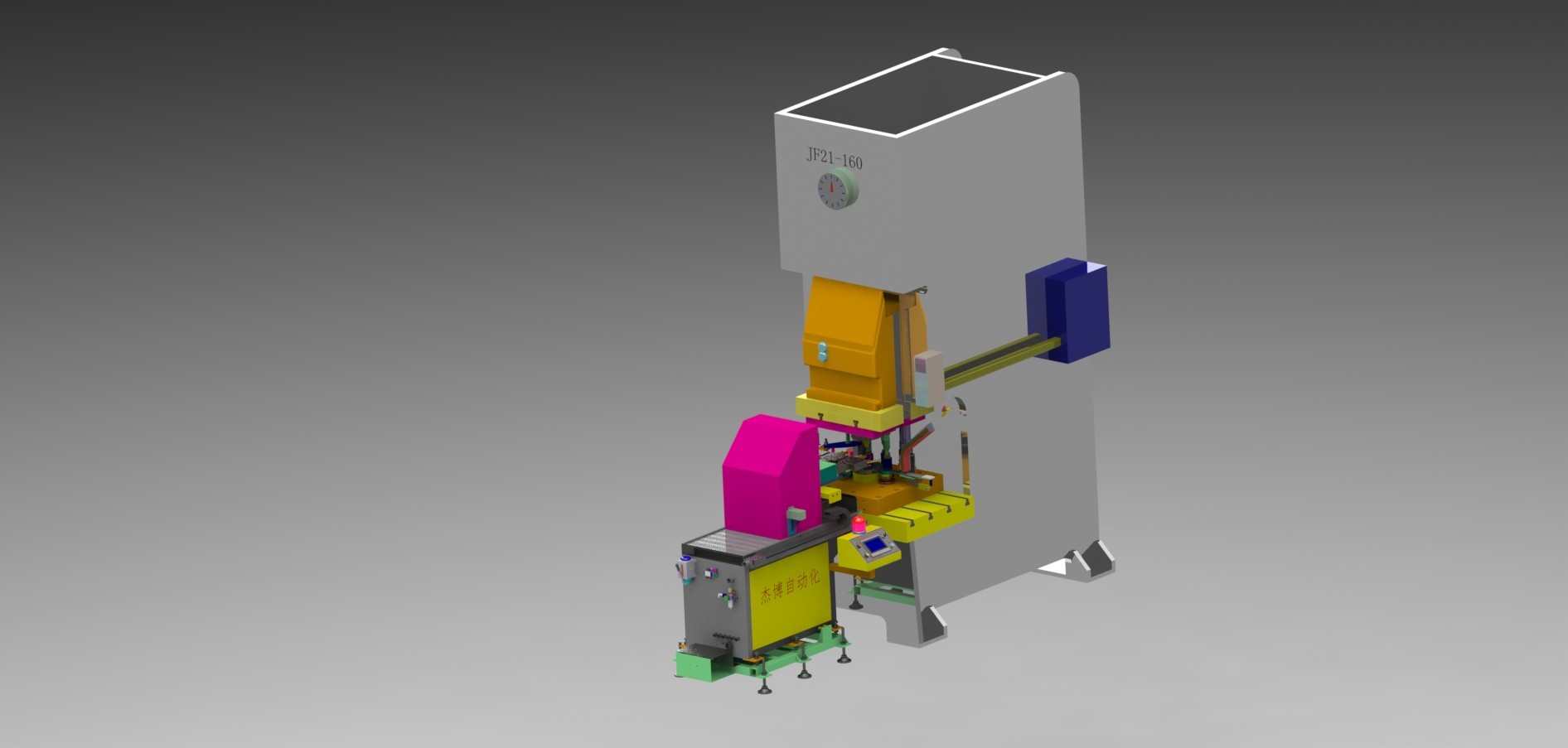 1、單機床多工序鍛壓,機械手多軸運動,機械手安裝在機床前面 ;